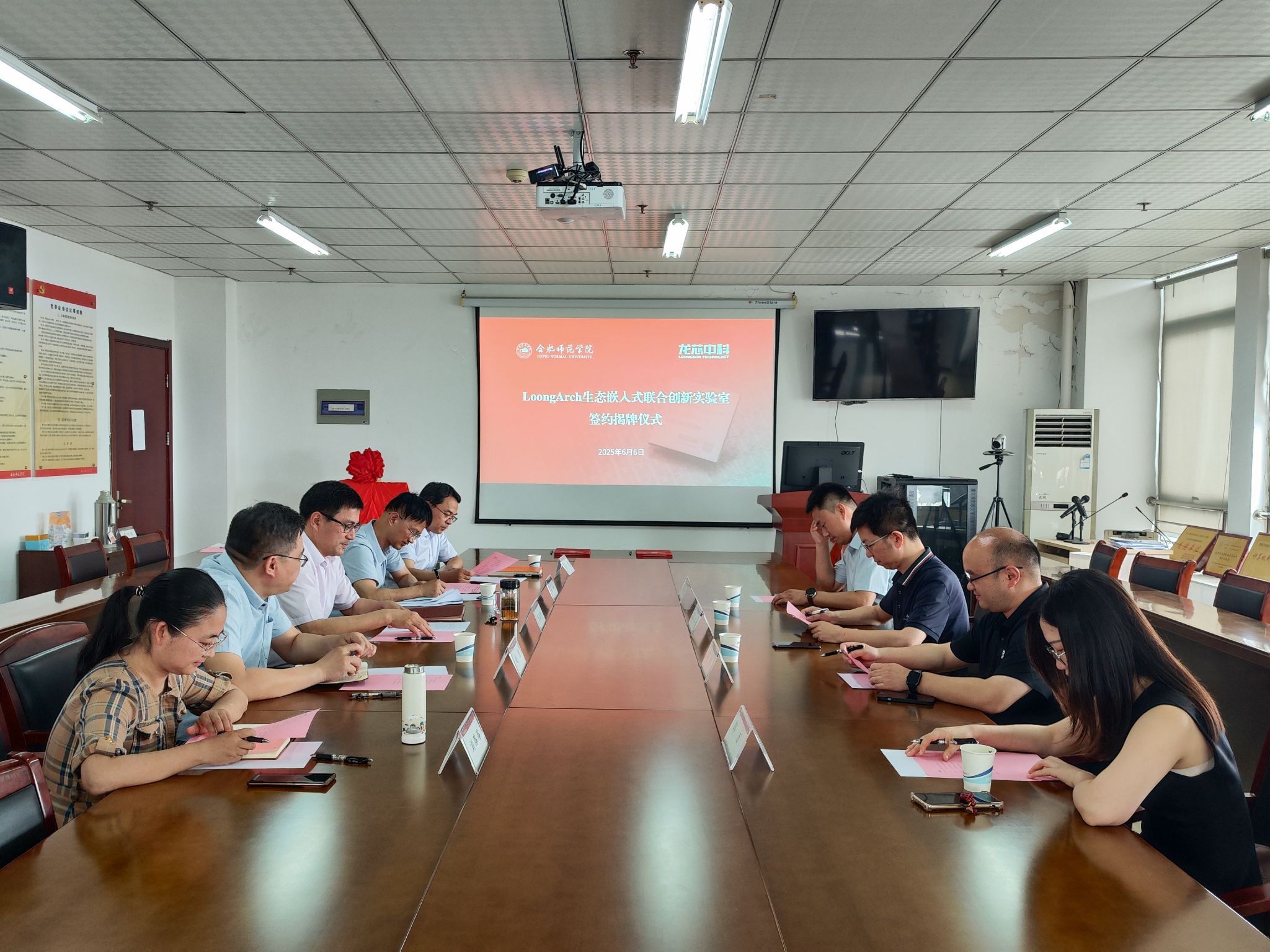 6月6日,yl23411集团-龙芯中科(合肥)技术有限公司共建LoongArch生态嵌入式联合创新实验室签约暨揭牌仪式在永利yl23411集团举行。院党委委员、副院长周端明,就业创业工作处处长李健,实验室建设与管理中心主任赵朋,永利yl23411集团院长谢飞、副院长刘路路,龙芯中科(合肥)总经理彭飞,教育BU经理郭凯,解决方案经理张文阳,业务经理郭丽等出席活动,会议由谢飞主持。