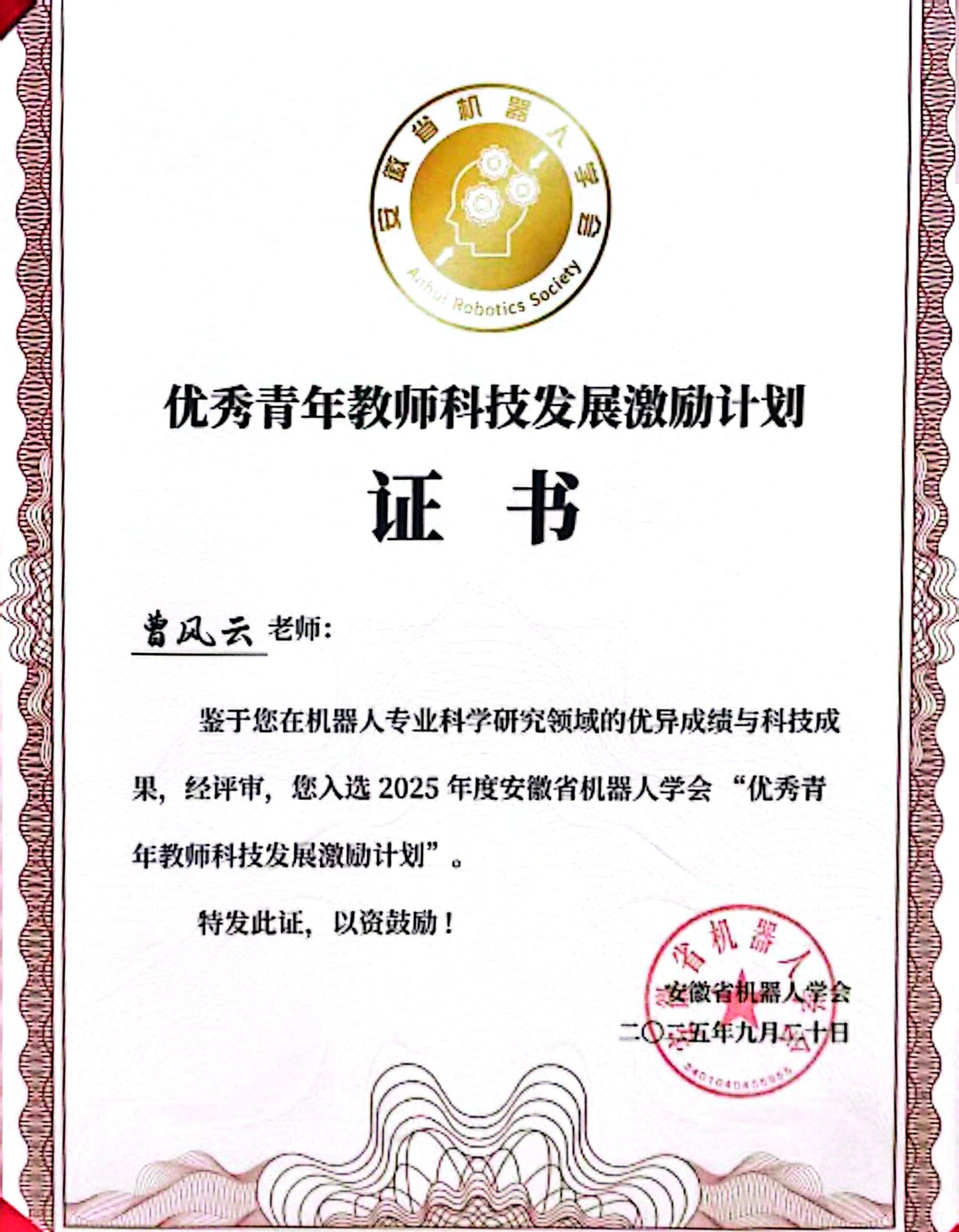 近日,第三届安徽省机器人大会暨智能机器人产业生态发展论坛在安徽工程大学召开,会上颁发了安徽省机器人学会2025年度奖励。永利yl23411集团曹风云老师荣获优秀青年教师发展激励计划奖励。