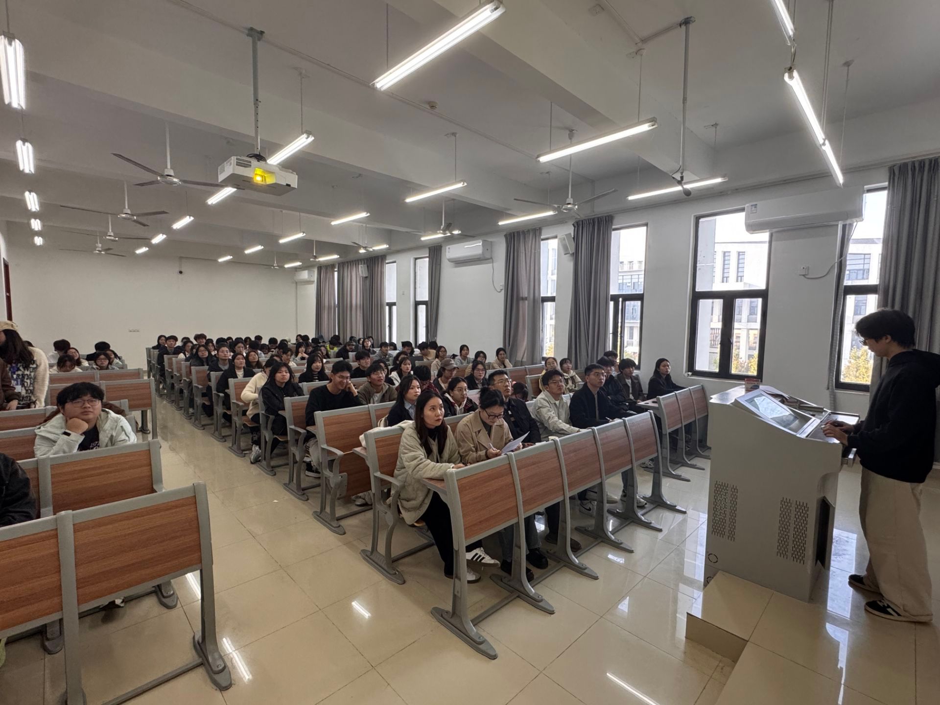 本次评选会通过汇报交流的形式,旨在通过分享与互鉴,提升基层学生组织的凝聚力与活力。会上,来自各年级的候选班级和宿舍代表依次上台,围绕思想建设、学风营造、舍风文化、创新创业、社会实践等多个维度,全面而生动地展示了各自集体的成长足迹与特色成果。汇报中,各位代表或慷慨激昂,或娓娓道来,用扎实的成绩和真挚的情感赢得了现场观众的阵阵掌声,充分展现了我院学子积极向上的精神风貌和团结协作的集体力量。