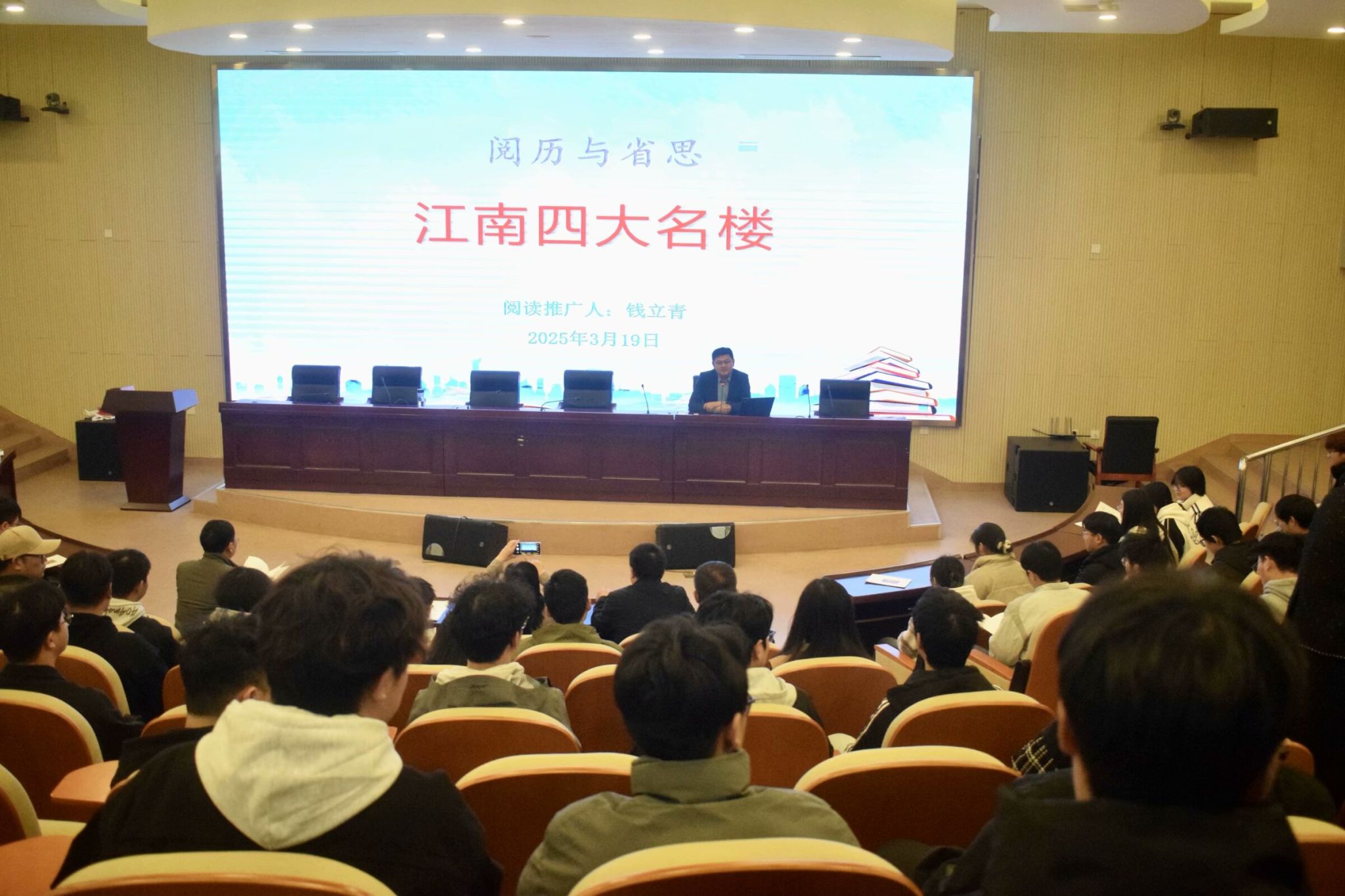 3月19日,“阅+历”读书讲堂“名家导读”系列讲座在滨湖校区多功能报告厅举办,江淮文化名家、安徽省十佳阅读推广人,教务处处长钱立青教授为同学们作了题为“阅历与省思:江南四大名楼”的讲座。永利yl23411集团学生代表150余人参加。滨湖校区综合管理办公室主任周荣,图书馆馆长方孝玲,美术与设计学院副院长吴道义,永利yl23411集团党委副书记杨萍出席。讲座由永利yl23411集团党委书记王祥主持。